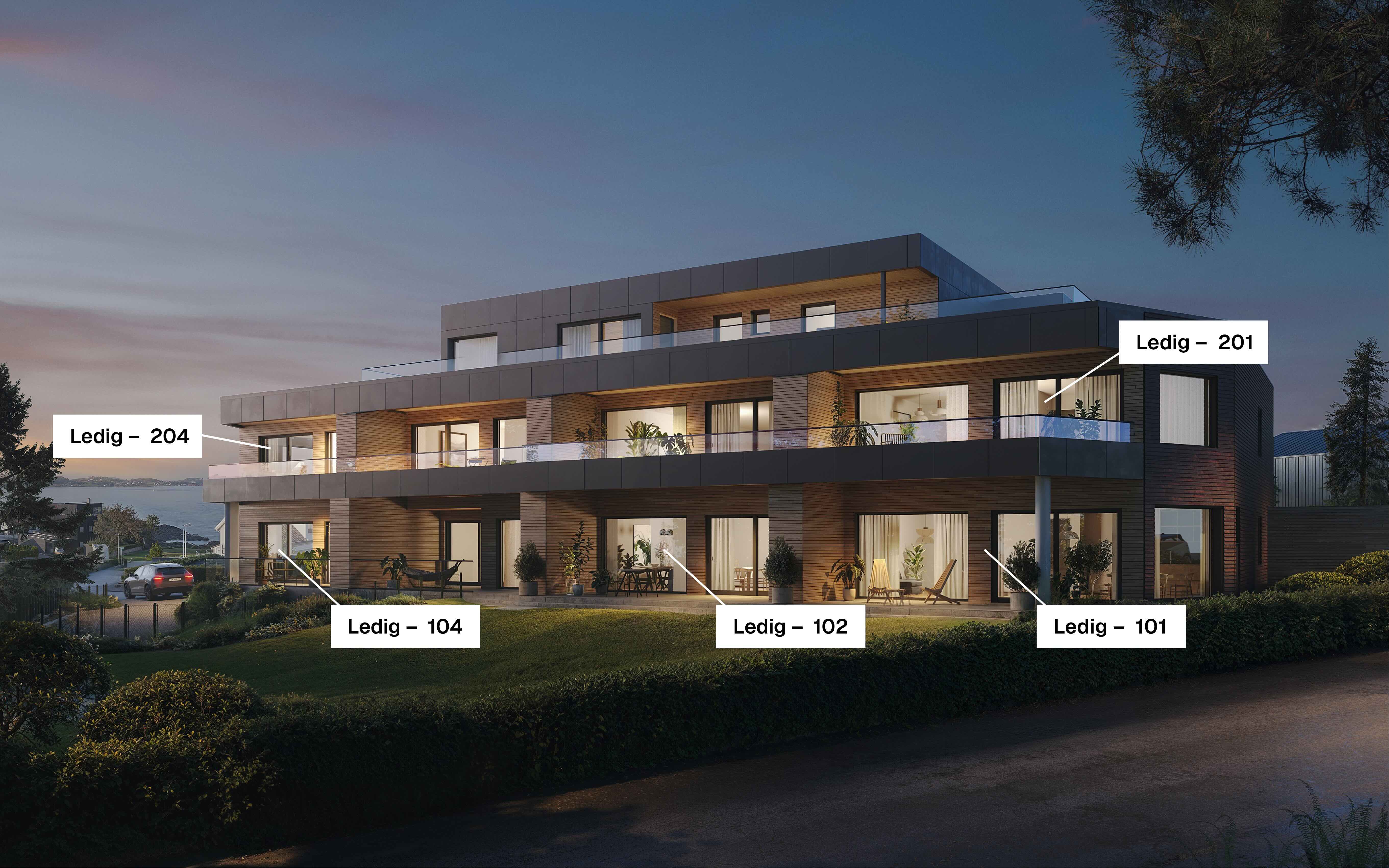 Samtlige fire leiligheter på bakkeplan får ordentlige hager med fjordutsikt – her blir hagene fra ca. 70 til 140 m2. Altså ikke bare små hageflekker, som vanlig er i denne type prosjekter.