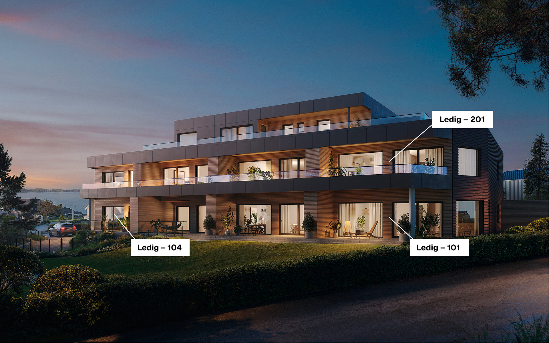 Samtlige fire leiligheter på bakkeplan får ordentlige hager med fjordutsikt – her blir hagene fra ca. 70 til 140 m2. Altså ikke bare små hageflekker, som vanlig er i denne type prosjekter.